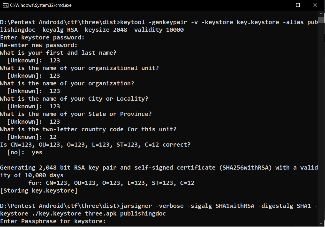 Lần lượt điền keystore và các thông tin, các bạn thích điền gì cũng được, mình để "123123" hết. Lệnh đầu tiên sẽ tạo key.keystore, lệnh thứ 2 sẽ sign apk bằng key vừa tạo.