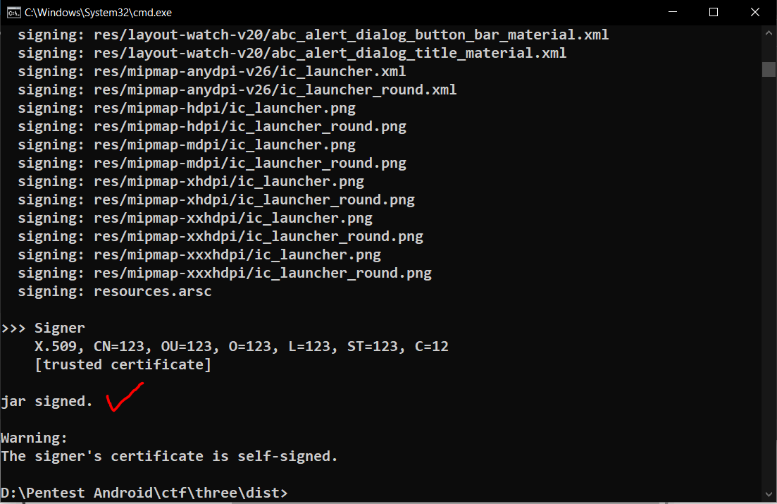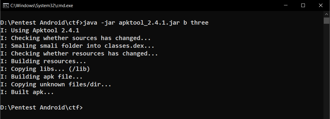 Khi đã sửa được code theo ý muốn, chúng ta cần từ các file đó build ra file apk mới. apktool cũng có chức năng cho phép build ra file apk sau khi sửa code, chỉ cần chạy lệnh: java -jar apktool_2.4.1.jar b three