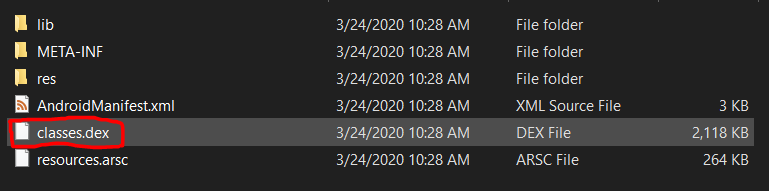 Trong các file giải nén ra có 1 file class.dex, file này chứa các class trong code java. Các lập trình viên sẽ thường code app Android bằng java/kotlin. Khi compile thì các file class sẽ được nén lại thành 1 file dex.