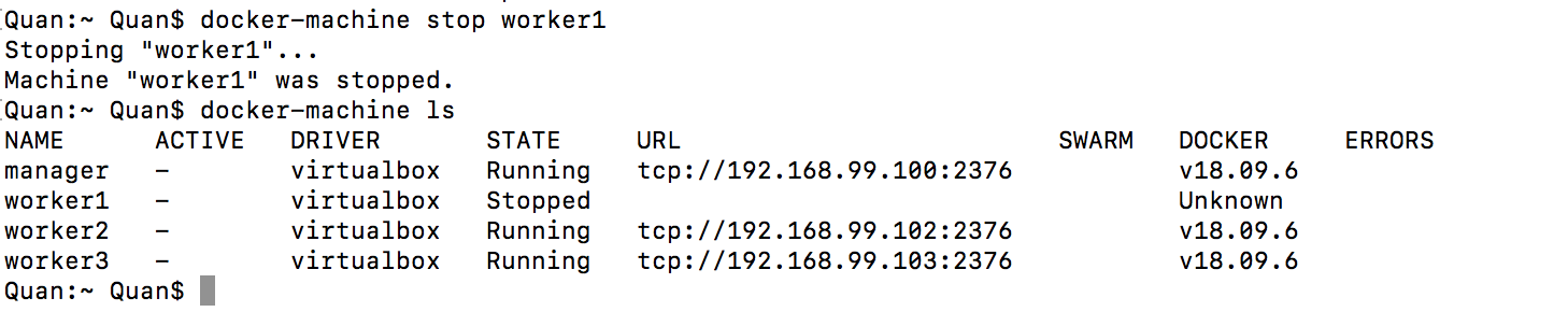 Bây giờ ta thử shutdown con machine worker1 ( như trên thực tế khi 1 server bị die ) xem có điều mới lạ gì không nhé !