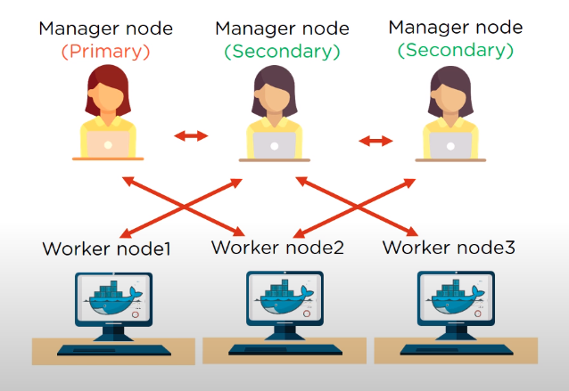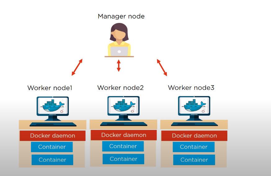Các container được quản lý bởi các Docker daemon trong các Worker node đã được chia nhỏ và quản lý tập trung bởi Manage node.