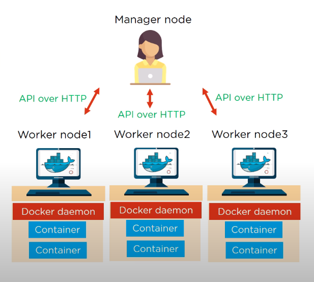 - Tất cả các Worker node giao tiếp với Manager node sử dụng API qua HTTP.