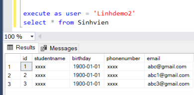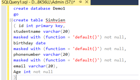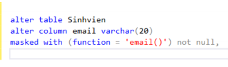 Tạo bảng sinhvien và áp dụng che giấu mặc định cho 3 cột: studentname ,birthday , phonenumber.