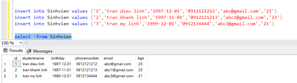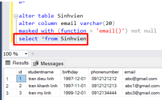 Nhập dữ liệu cho bảng sinhvien. Vì đang chạy truy vấn trong tài khoản đặc quyền, chúng ta có quyền truy cập đầy đủ vào dữ liệu, mặc dù đã thực hiện các quy tắc che giấu. Vì lý do này, câu lệnh SELECT sẽ trả về cùng kết quả (được hiển thị trong bảng sau) mà chúng ta sẽ nhận được nếu các quy tắc che giấu không được thêm vào các định nghĩa cột.