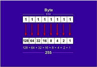 Trong 1 byte (8 bit) , mỗi bit được gán một giá trị. Nếu bit được đặt là 0 thì nó được gán giá trị 0, nếu bit được đặt là 1 thì có thể chuyển đổi thành 1 giá trị thập phân. Bit thấp nhất trong byte tương ứng với 1, bit cao nhất tương ứng với 128. Vậy giá trị lớn nhất của 1 byte là 255 tương ứng với trường hợp cả 8 bit đều được đặt là 1.