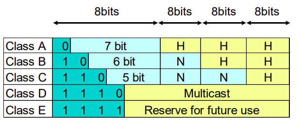 Không gian địa chỉ IP được chia thành các lớp như sau: