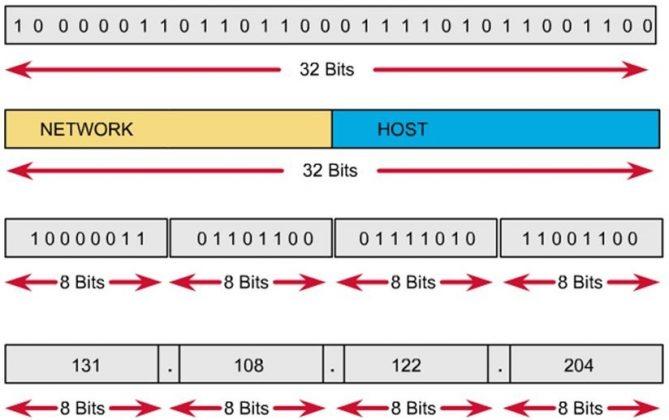Địa chỉ IP gồm 32 bit nhị phân , chia thành 4 cụm 8 bit (gọi là các octet). Các octet được biểu diễn dưới dạng thập phân và được ngăn cách bằng các dấu chấm.