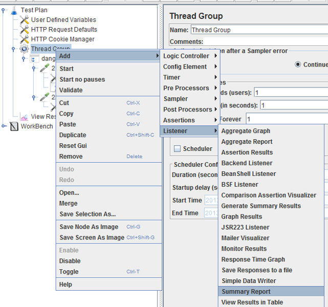 - Muốn thêm một Listener cho một hành động, ta click chuột phải vào hành động đó rồi chọn Add Listener Listeners muốn thêm. Để theo dõi quá trình chạy, ta thêm các Listener với các chức năng tương ứng sau: