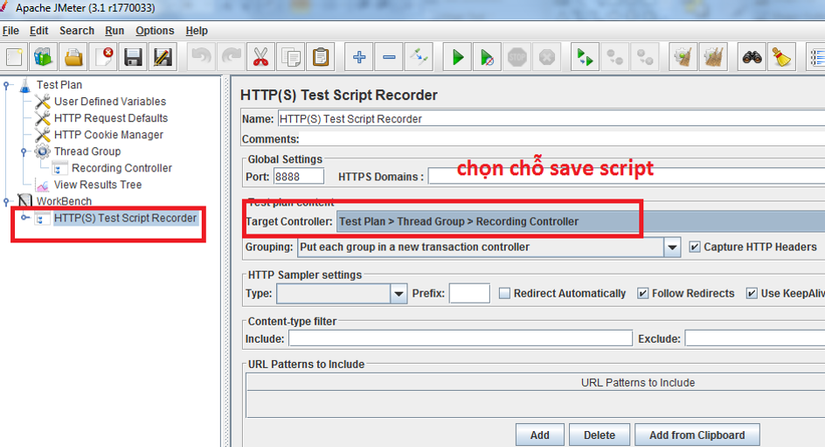 - Target Controller : Để xác định nơi bạn muốn Jmeter lưu trữ tất cả các yêu cầu được ghi lại.Theo mặc định, nó có giá trị “Recording Controller”, nhưng bạn có thể thay đổi nó thành “Thread Group” hoặc bất kỳ bộ điều khiển nào khác.