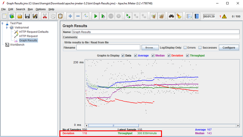 - Xanh dương : Trung bình samples hiện tại Để phân tích kết quả của bất cứ kịch bản test nào, chúng ta cũng nên tập trung vào 2 chỉ số là: Throughput và Deviation (độ lệch chuẩn)
