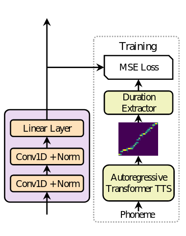 Tuy nhiên quá trình huấn luyện các tham số của Duration Predictor có hơi đặc biệt: tác giả sử dụng một mô hình gọi là "teacher model" dựa trên mạng hồi quy Transformer để trích xuất thời lượng của mỗi âm vị, cụ thể với mỗi cặp dữ liệu, trích xuất các attention alignments của decoder-to-encoder trong teacher model. Bởi vì mô hình sử dụng multi-head attention nên sẽ có nhiều head của attention. Tuy nhiên không phải tất cả các head này đều được sử dụng mà tác giả đã đưa ra một tỉ lệ (focus rate)