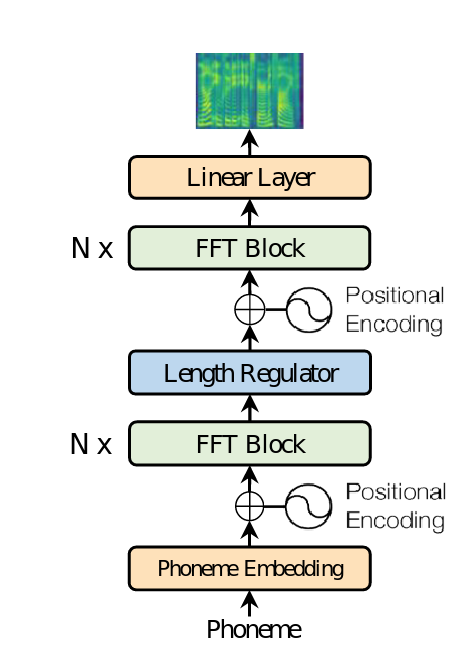 - Bộ điều chỉnh độ dài (length regulator) xác định độ dài của các mel-spectrograms từ đó dễ dàng điều chỉnh tốc độ giọng nói bằng cách kéo dài hoặc rút ngắn thời lượng của âm vị cũng như điều chỉnh âm điệu bằng cách thêm vào các khoảng ngắt giữa các âm vị liền kề.
