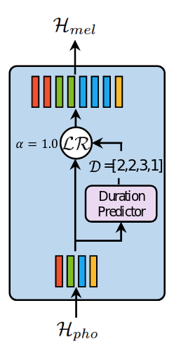 Thông thường, mỗi mô hình sẽ có các tham số để tính mel-spectrogram cố định, mỗi cửa sổ sẽ tương ứng với một thời gian nhỏ, mỗi một âm sẽ có độ dài khác nhau do đó sẽ tương ứng với số lượng các cửa sổ phổ khác nhau, ký hiệu số này là , gọi là thời lượng âm. Thời lượng âm sẽ được dự đoán qua bộ dự đoán "Duration Predictor". Sau đó dựa vào , LR sẽ điều chỉnh kích thước của vector trạng thái ẩn bằng cách lặp lại các trạng thái một số lần bằng với thời lượng âm tương ứng trong Nghe trìu tượng quá nhỉ, hãy cùng xem xét ví dụ sau: