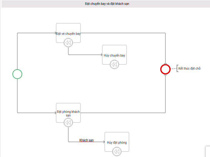 Ví dụ trên có ý nghĩa là nếu task đặt vé chuyến bay và đặt phòng khách sạn thành công thì kết thúc đặt chỗ, ngược lại nếu thất bại thì sẽ quay lại trạng thái ban đầu (trả lại số vé và số phòng đã đặt)