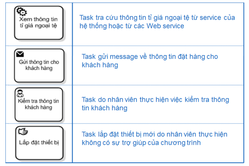 Task mô tả hành động trong một xử lý mà không thể chia nhỏ hơn hay chi tiết hơn. Task có thể chia làm 2 loại chính :