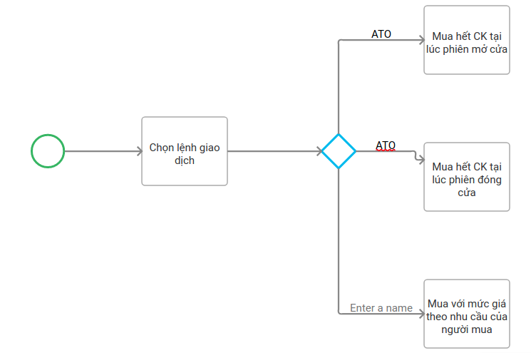 Rule / Conditional: process được kích hoạt theo điều kiện nào đó (vd như khi có giá 23.3 thì mới khớp lệnh mua.) |