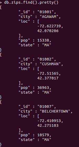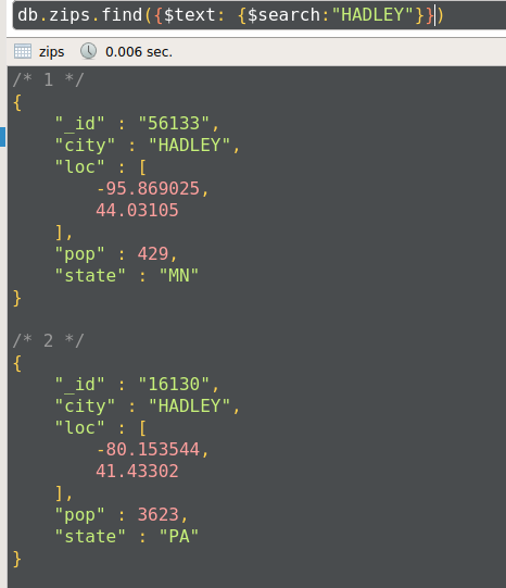 db.zips.find({$text: {$search: "HADLEY"}).pretty()