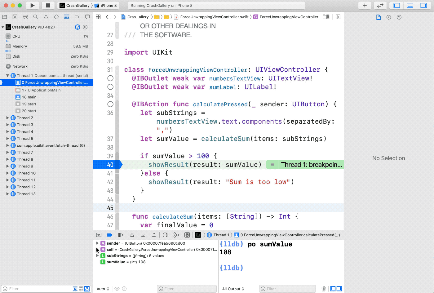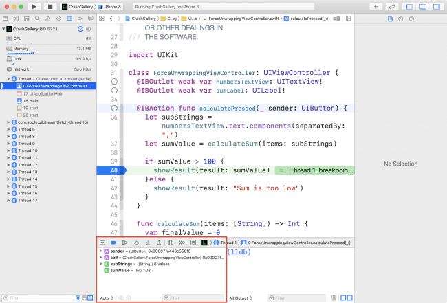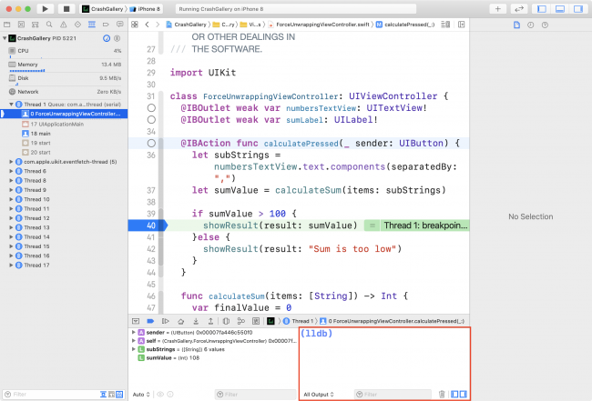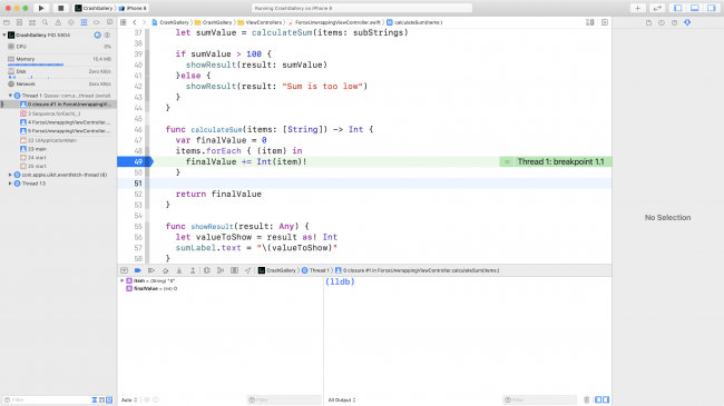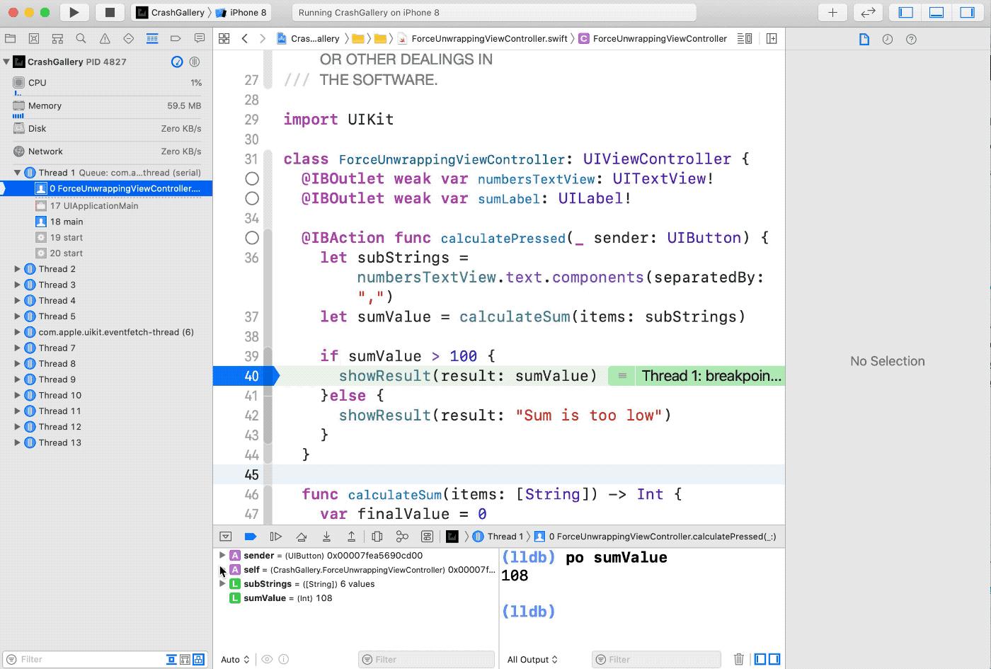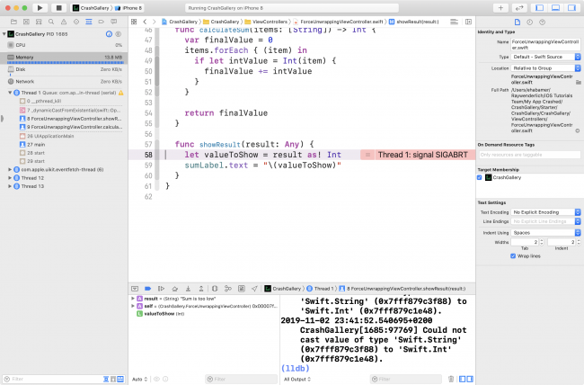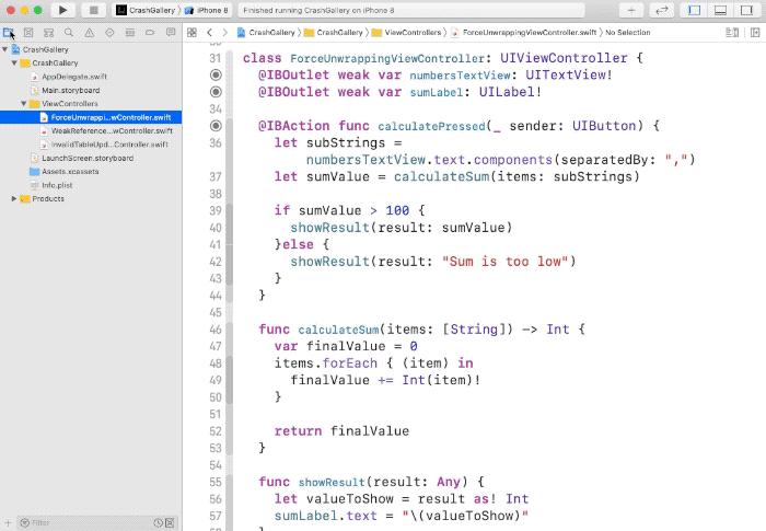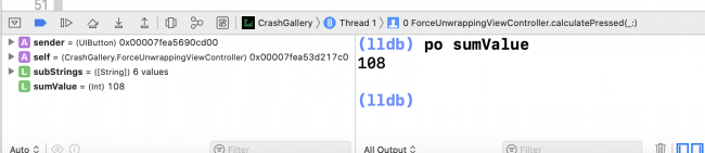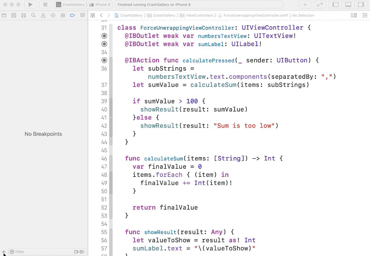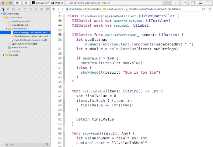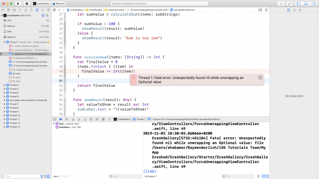 Crash nằm trong ForceUnwrappingViewController.swift trên dòng số 49. Hãy xem Xcode hiển thị cho bạn - có một điểm nhấn màu đỏ trên dòng kích hoạt crash.