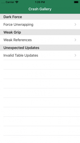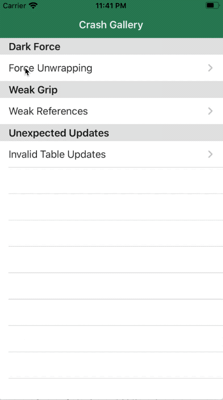 Build and run the app, sau đó mở mục đầu tiên - có tiêu đề Force Unwrapping - trong màn hình gallery.