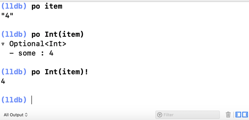 Lệnh po tức là print object, đó là lệnh LLDB để in mô tả của một object. Bạn cũng có thể sử dụng p, nhưng kết quả trong console sẽ trông hơi khác.