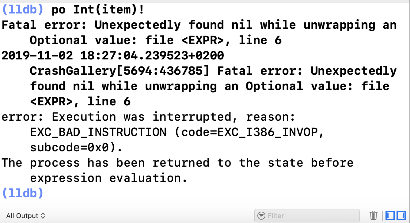 Lưu ý: Exception breakpoint lệ được kích hoạt bởi crash xảy ra trong thời gian chạy Objective-C, trong hầu hết các trường hợp có nghĩa là những thứ bên trong UIKit. Hầu hết các crash Swift sẽ khiến trình gỡ lỗi dừng trên dòng thực tế mà bạn đang tìm kiếm.