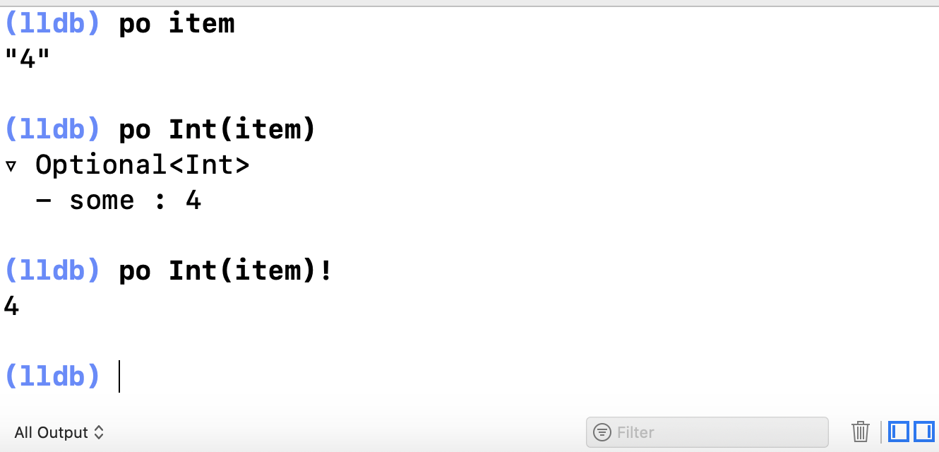 Vì vậy Int(item) là nil, và khi bạn gõ po Int(item)! bạn sẽ nhân đc thông báo sau:
