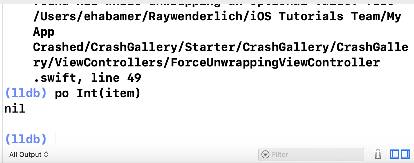 Console Log nằm ở cuối cửa sổ Xcode. Nó sẽ hiển thị nhiều log hữu ích trong khi app đang chạy. Bất cứ khi nào app của bạn crash, bạn sẽ tìm thấy một thông điệp tường trình chứa thông tin về bản chất của crash, cho dù đó là một chỉ mục nằm ngoài phạm vi ngoại lệ, tham chiếu nil hoặc một cái gì khác.