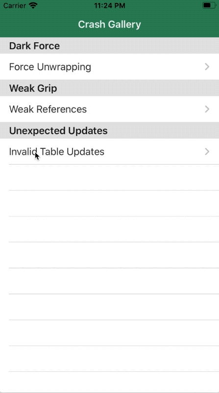 Lần này, Xcode đã dừng trong InvalidTableUpdatesViewController.swift trên dòng 37. Log bị trống và không có thông tin nào được cung cấp vì điểm dừng đã dừng ngay trước khi exception xảy ra. Đây là một loại crash khác với những lần trước.