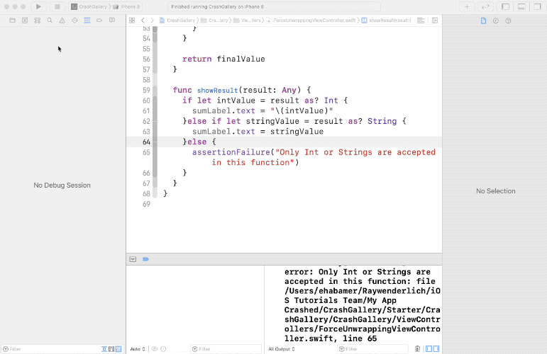 Một ví dụ về thời điểm tiện dụng này có trong ForceUnwrappingViewController.swift. Sẽ không có gì xảy ra trong showResult(result:) nếu result không được lồng vào Int hoặc String, và bất cứ ai đang sử dụng code của bạn đều không biết điều gì đang diễn ra ngay lặp tức. Tất nhiên họ đã làm điều gì đó sai, nhưng sẽ thật tuyệt vời nếu code đủ thông minh để nói với họ điều gì?