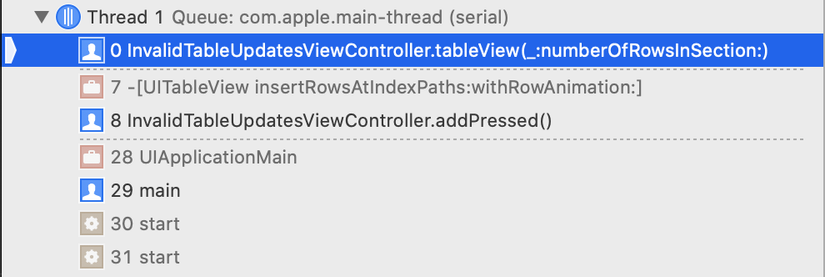 Mở InvalidTableUpdatesViewController.swift và thêm các breakpoint trên dòng 37, điều này gây ra crash và trên dòng 44, đó là sự return của tableView(_:numberOfRowsInSection:) . Nhấn nút Add để ứng dụng dừng ở breakpoint đầu tiên, sau đó nhấn Continue. Bây giờ, hãy nhìn vào ngăn xếp cuộc gọi bên trái: