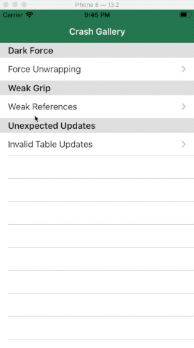 Ứng dụng của bạn bị crash trong ForceUnwrappingViewController.swift trên dòng 65.