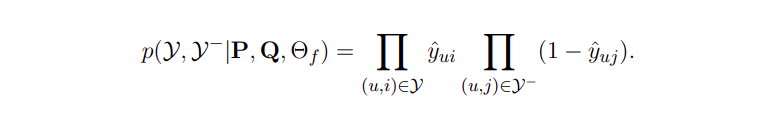 Ta sẽ nhận được đầu ra nằm trong khoảng (0, 1) nhờ hàm activate của lớp cuối cùng. Giá trị của đầu ra thể hiện độ liên quan giữa người dùng và sản phẩm. Điểm càng cao thì độ liên quan càng cao. Để học tham số của mô hình, ta sử dụng hàm likelihood có công thức như sau: