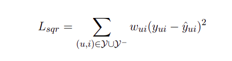 Giả sử trong các tương tác người dùng và sản phẩm, ta kí hiệu Y là tập các tương tác xảy ra và quan sát được, Y− là tập các tương tác không quan sát được hay chính là các tương tác không xảy ra trong thực tế, là hệ số của cặp học (u,i). Ta có hàm mục tiêu là hàm độ lệch bình phương giữa điểm dự đoán và điểm thực tế: