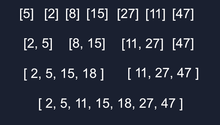 Nó sẽ trở lại khi chúng ta có các mảng 1 mục, sau đó chúng ta sẽ sử dụng hàm merge bên trên để bắt đầu xây dựng lại chúng thành một mảng lớn, với mỗi lần merge sẽ sắp xếp lại chúng.