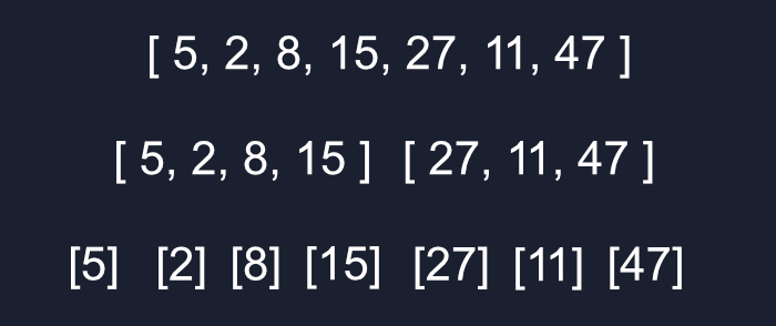 Đầu tiên, chúng ta cần lấy toàn bộ mảng và chia nó thành nhiều mảng con bằng cách liên tục tách mọi thứ ra làm đôi cho đến khi mọi thứ nằm riêng trong mảng của chính nó.