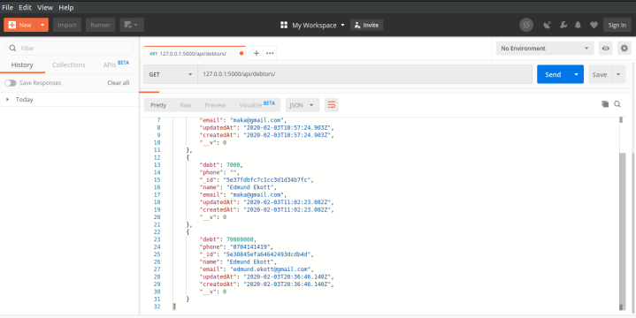 Đoạn code ở trên xác định một lược đồ mongoose được gọi là DebtorSchema, nó cũng chỉ định mô hình có các trường sau: ame, email, debt and phone và timestamps (created_at and updated_at) các trường mà việc tạo và bảo trì sẽ được mongoose xử lý tự động. Tương tự như vậy chúng ta sẽ tạo model User đường dẫn models/User.js