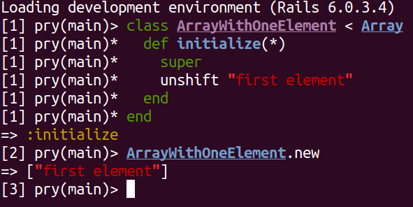 Chúng ta thấy có 2 group example là (1) RSpec.describe Array và (2) describe ArrayWithOneElement vì (2) nằm bên trong (1) nên subject method bên trong những example của (2). Dễ dàng có thể thử được kết quả trả về của subject method là: