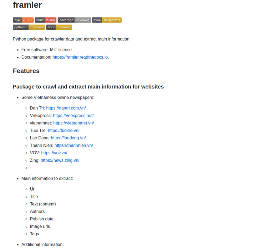 Trước khi đi đến phần tiếp theo, mình muốn giới thiệu cho các bạn một thư viện open-source rất hữu ích cho những bạn nào đang làm về xử lý ngôn ngữ tự nhiên và gặp khó khăn trong việc tìm kiếm và thu thập thêm nguồn data - một công cụ giúp các bạn dễ dàng lấy xuống nội dung, thông tin của các trang báo trong và ngoài nước: Framler (Crawler thần thánh)