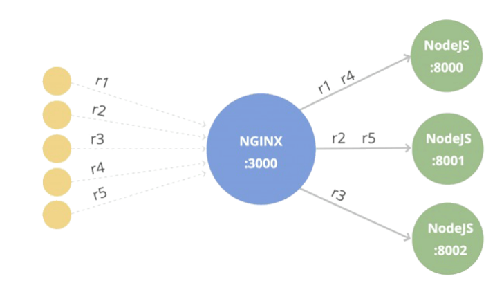 r1 -> nodejs:8000, r2-> nodejs:8001, r3-> nodejs:8002, ..... tức là gửi xoay vòng lần lượt.