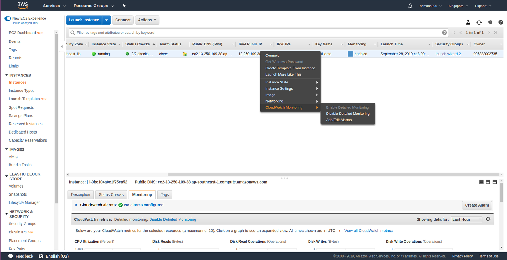 Ở đây mình sử dụng để theo dõi máy chủ ec2. Sau khi enable và mở tab monitoring thì sẽ thấy được tình trạng sử dụng tài nguyên của máy chủ.