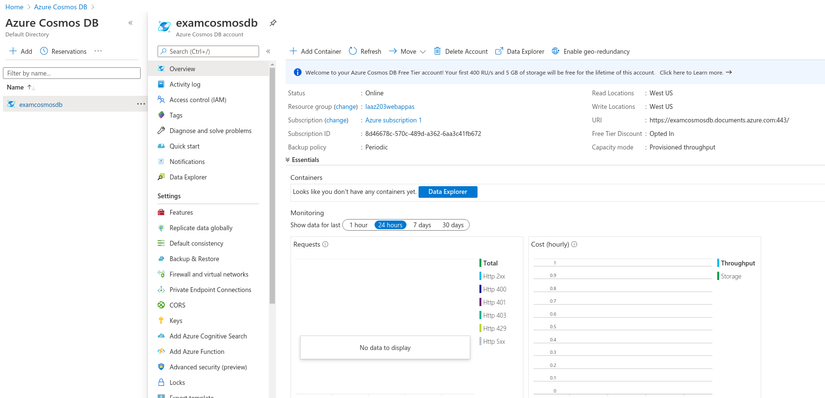 - Bây giờ bạn có thể vào tài khoản Azure Cosmos DB thực hiện các thao tác cần thiết như : add Database, add container, add dữ liệu vào DB đã tạo, query Data...