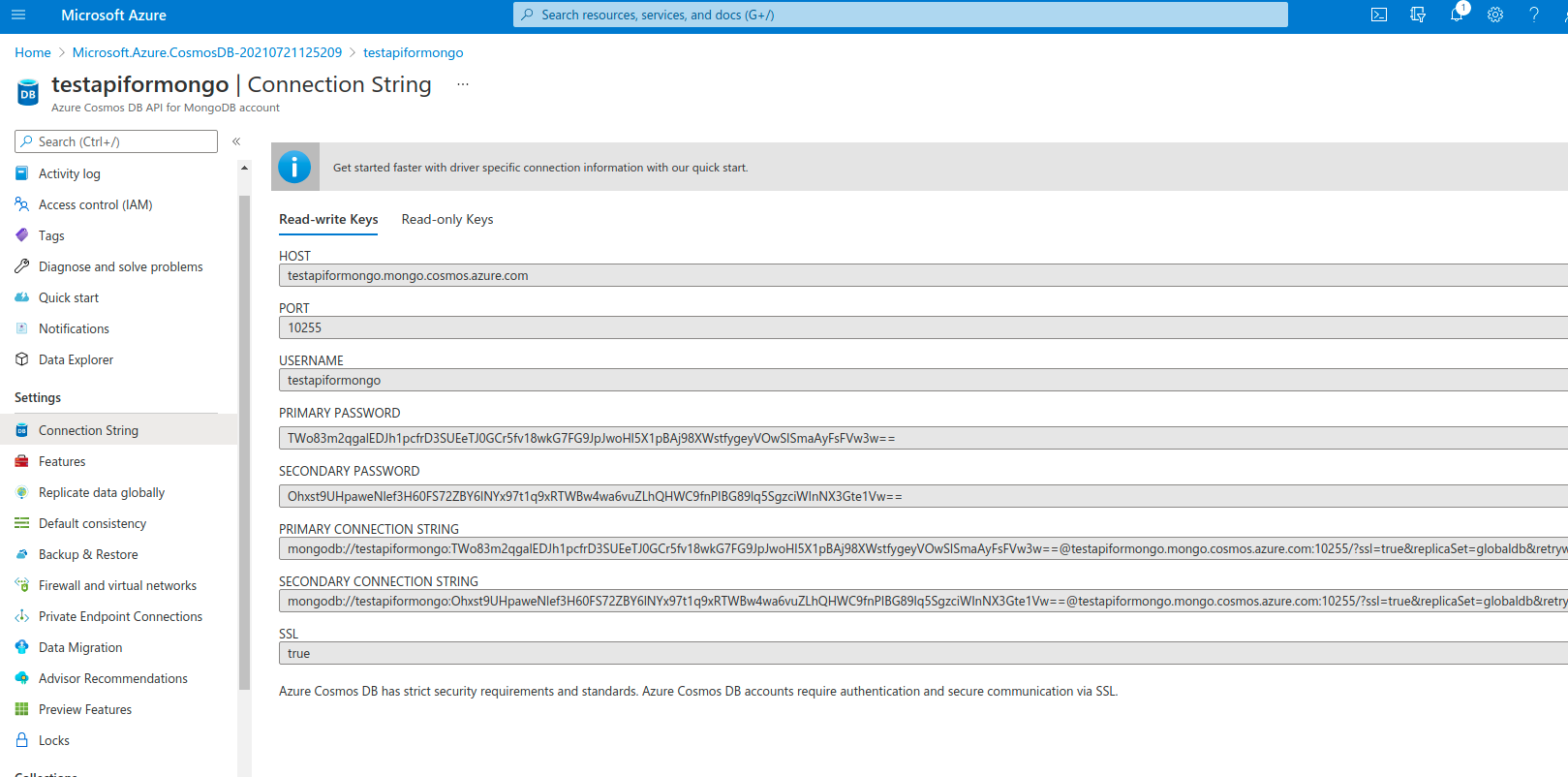 Trên giao diện của Azure thì chúng ta có 2 cách để lấy connect string trên Azure để kết nối MongoDb với Azure.