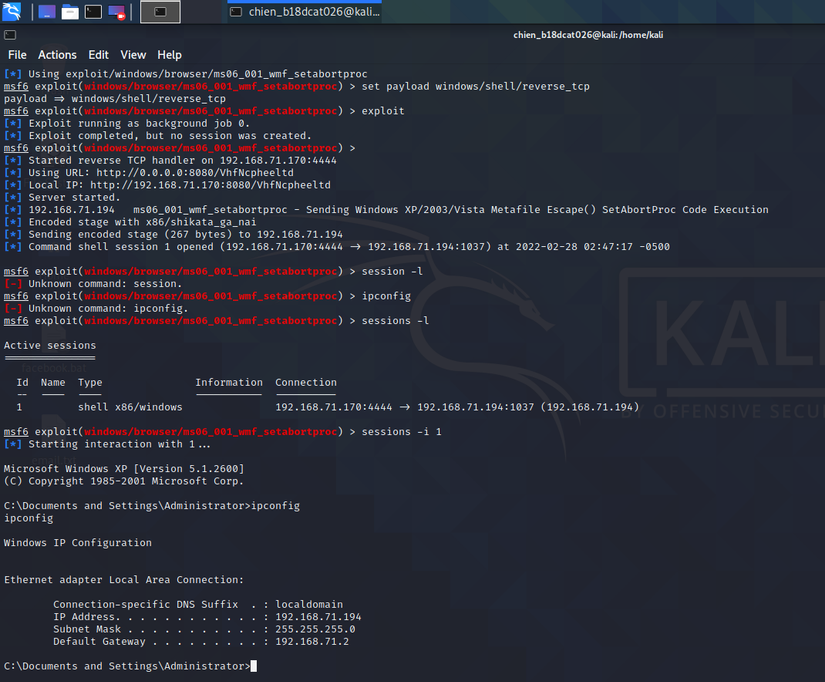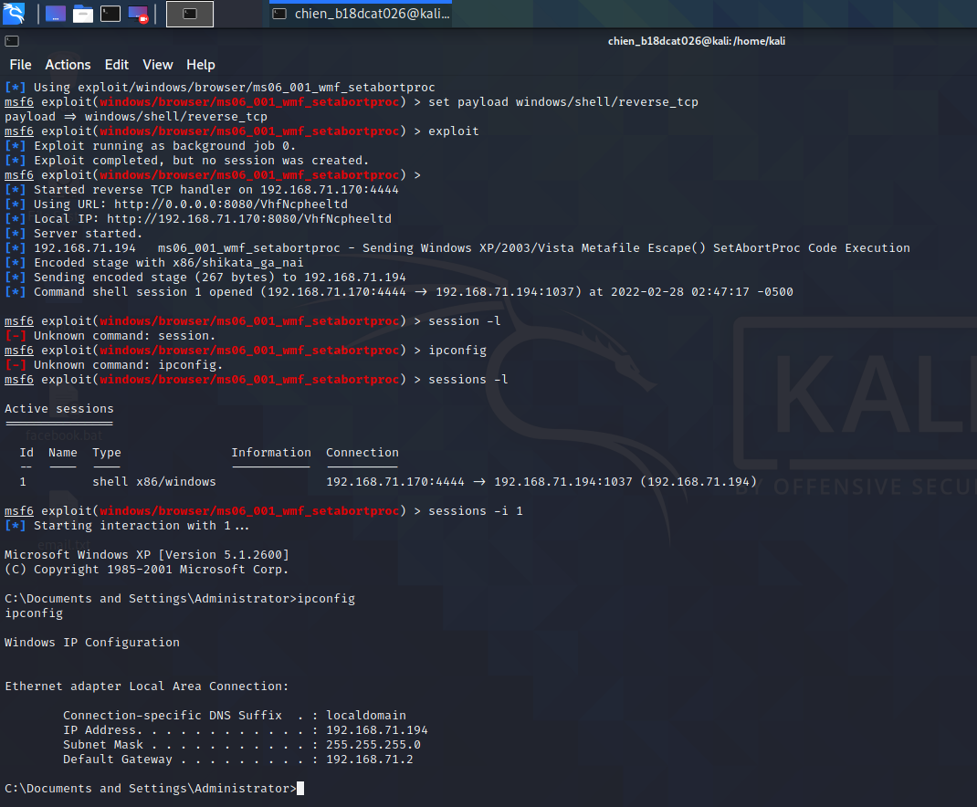 Kiểm tra máy attacker xác nhận bắt được kết nối ngược trở lại từ máy Windows XP. Thực hiện truy cập vào phiên kết nối (sessions -i 1) và chạy ipconfig kiểm tra địa chỉ ip của máy đang chiếm quyền, xác nhận địa chỉ ip là của máy victim. Vậy là khai thác thành công.