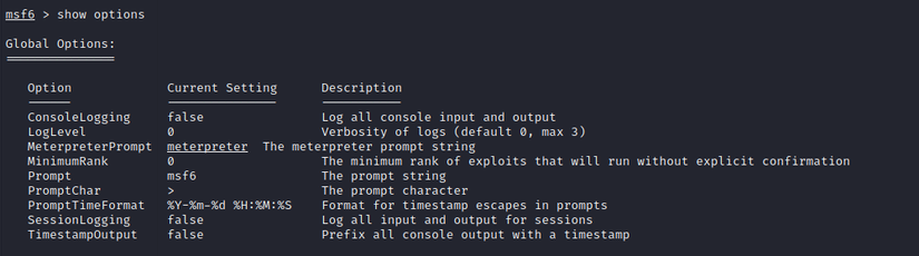 Với tham số options thì câu lệnh trên sẽ tương đối đặc biệt hơn một chút. Các options kiểm soát các cài đặt cần thiết cho các chức năng riêng biệt trong từng module. Chạy lệnh show options trong khi module được chọn, Metasploit sẽ chỉ hiển thị các options áp dụng được với một module riêng biệt. Khi show options không ở trong một module sẽ hiển thị những options toàn cục có sẵn.