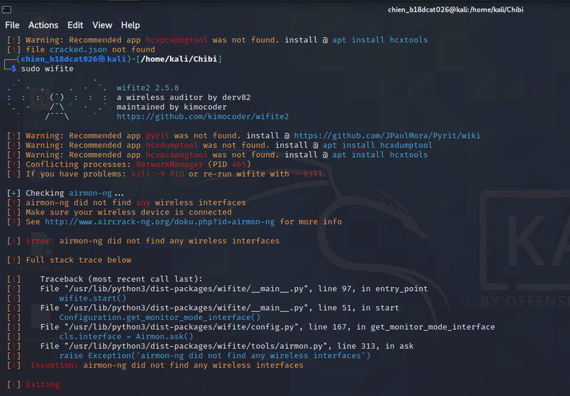 Thực hiện chạy wifite để kiểm tra wifi xung quanh. Tuy nhiên ở đây ta thấy thông báo không có wifi nào được tìm thấy (cái này do mình chạy máy ảo kết nối vào máy thật nên ko có wifi).