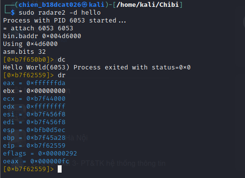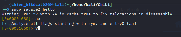 Bên cạnh đó ta có thể sử dụng –d để chạy radare2 dưới dạng debug.