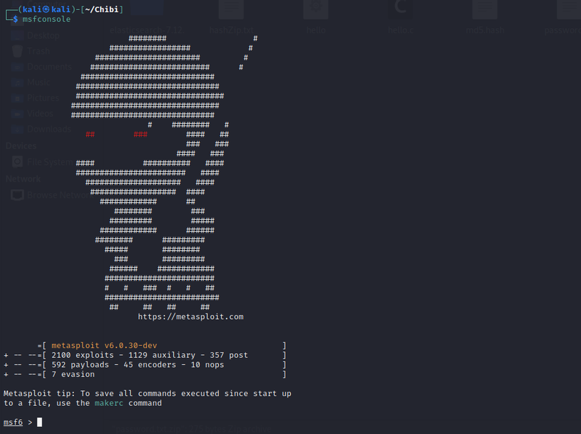 Sử dụng các lệnh cơ bản trong Metasploit: Tại giao diện cửa sổ terminal, sử dụng câu lệnh msfconsole để khởi tạo Metasploit Framework.
