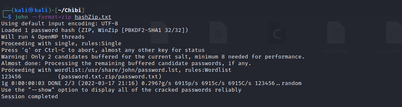 Bẻ khóa băm, gõ lệnh: john --format=zip hashZip.txt trong đó zip là định