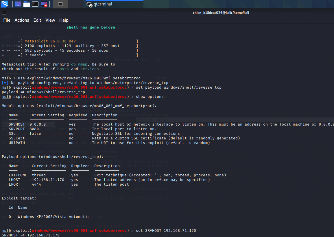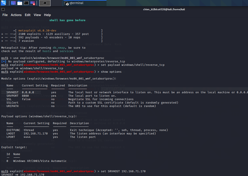 Sau đây là một ví dụ khai thác lỗ hổng Microsoft Security Bulletin - MS06-001 (Lỗ hổng trong Công cụ kết xuất đồ họa cho phép RCE). Setup môi trường cần 1 máy attacker chạy kali linux có metasploit, 1 máy victim chạy hệ điều hành windows XP phiên bản chưa được cập nhật trước 2006 (ở đây mình sử dụng Windows XP Professional 5.1.2600, SP2 bản chưa update).
