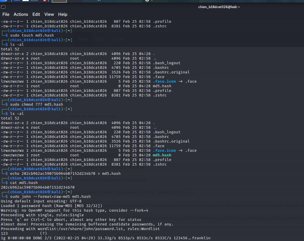 Thực hiện tạo 1 file là md5.hash để lưu dữ liệu vừa hash. Để thực hiển bẻ khóa mã hash MD5 trên với John the Ripper, ta thực hiện lệnh: